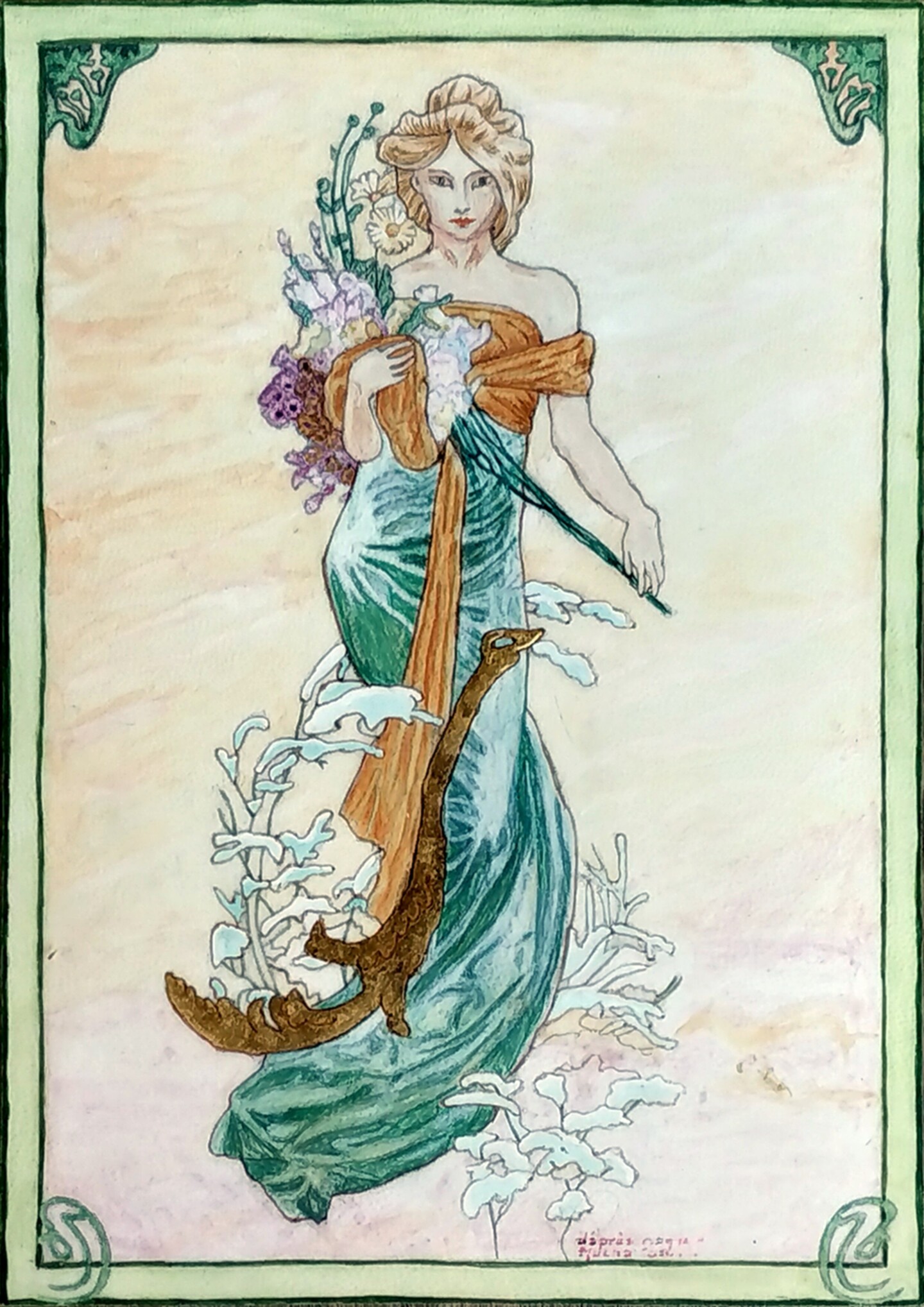 Cette création a vu le jour pour l'anniversaire d'un être cher. Comme j'adore l'art nouveau, j'ai choisi l'une des représentation de l'été (saison de sa naissance) d'Alfons Mucha. Le J réalisé à la feuille d'or représente une branche stylisée avec ses feuilles (Initiale de son prénom)